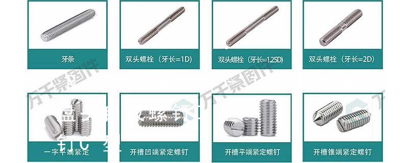 螺栓有:1、方头螺栓,2、半圆头方颈螺栓,3、十字槽盘头螺钉,4、内六角沉头螺钉,5、方螺母C级,6、蝶形螺母,7、六角头螺栓,8、十字槽盘头自攻螺钉。大小有M18、M6、M8、M16、M10、M12、M14、M20等型号。通常用